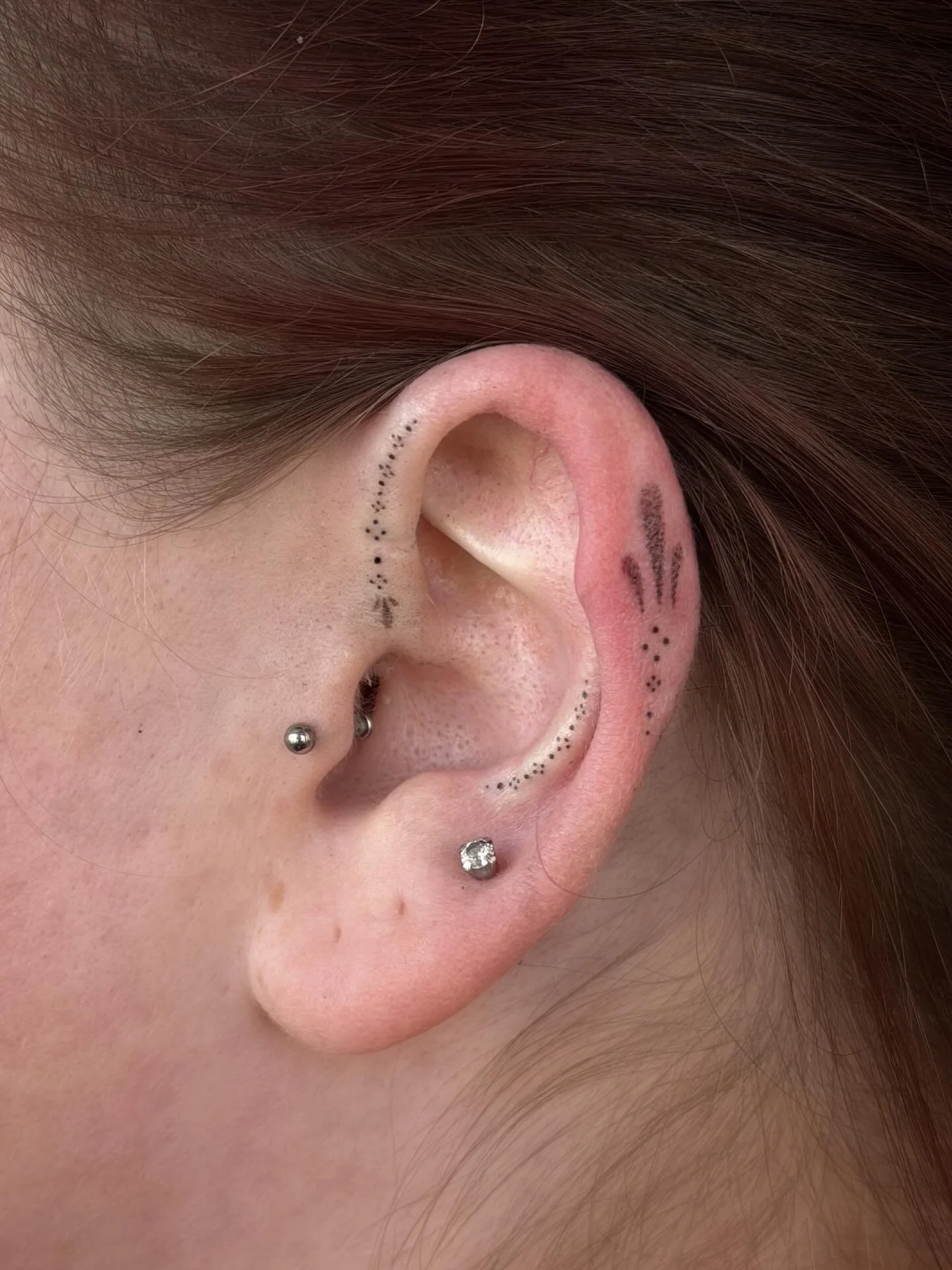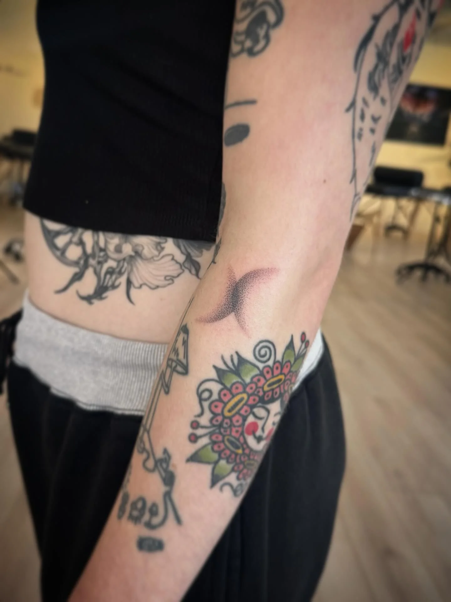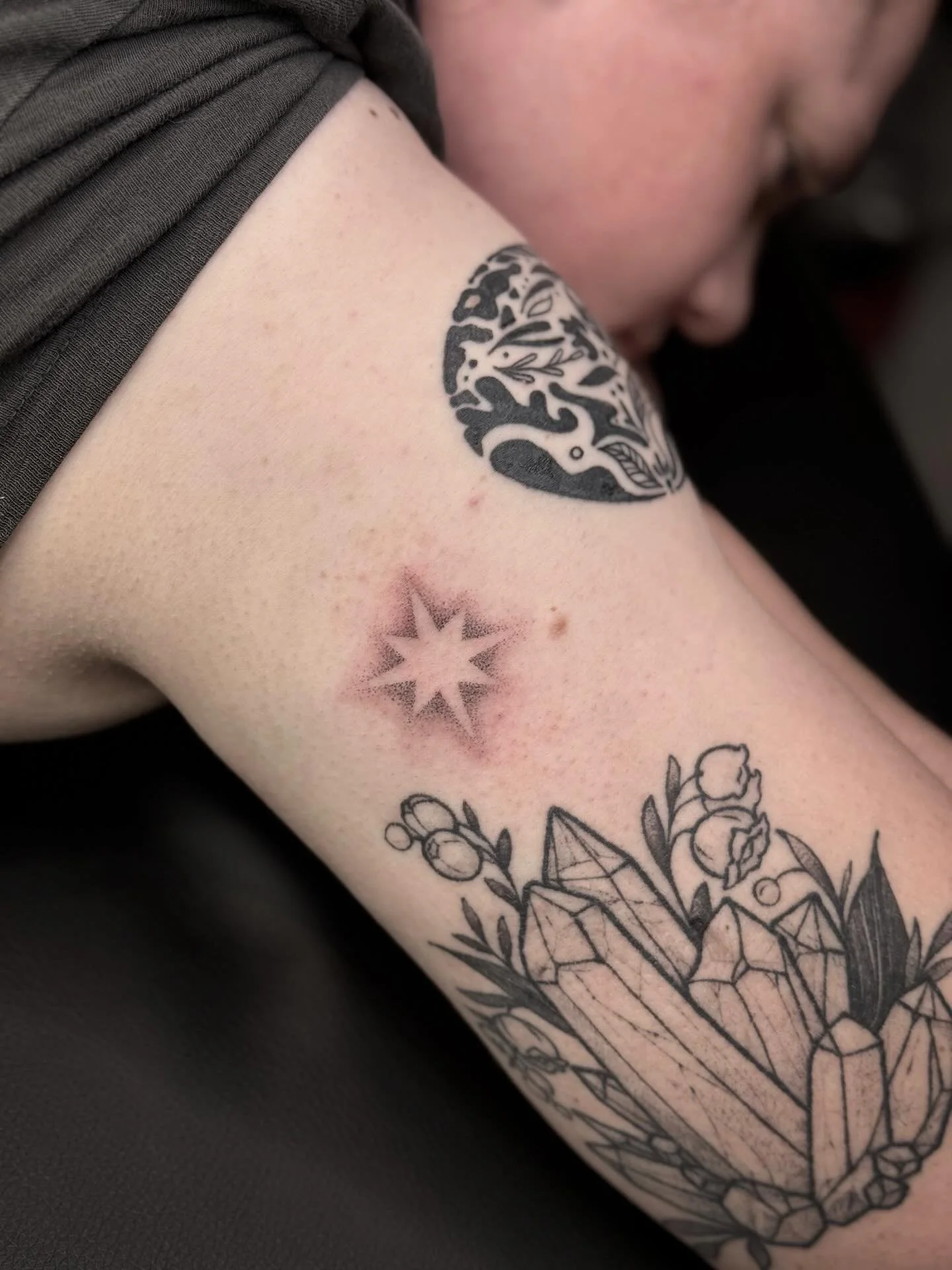 To give a little bit of background, I grew up in southern California within what I would call a moderately conservative household. I think I always understood myself to be a deeply creative and also fairly conflicted person. The structures that existed with my home and the ones I was expected to build a life within felt misaligned, rigid, maybe a bit suffocating, and as I gained perspective through my own life experiences, I was able to recognize that my path toward fulfillment and wholeness wouldn't likely fit within the aforementioned structures. That my choices would probably look a little different... which is how I ended up here in Minnesota tattooing! In 2011, I enrolled in my freshman year at a university to study design, realized I could not afford to continue beyond that first year and so instead decided to go to cosmetology school. I moved around the country a bit continuing to do hair, until I was offered an opportunity to learn a bit more about the aesthetics side of my license. During the next 3 years, I would build a cliental in brow shapings among other esthetic services and then eventually would pivot toward cosmetic tattooing (and later, handpoke tattooing). In March of 2021, I went to Los Angeles to complete my foundational cosmetic tattooing certification. Shortly after that, I secured a tattooing apprenticeship in Minneapolis and moved to Minnesota that summer. Since the completion of my apprenticeship, I've worked to strengthen and expand my skillset through various classes, workshops and collaborative forum with other industry professionals. My hope is that we are able to continue to elevate the client experience as we learn, grow and evolve alongside the ever-changing tattooing industry.