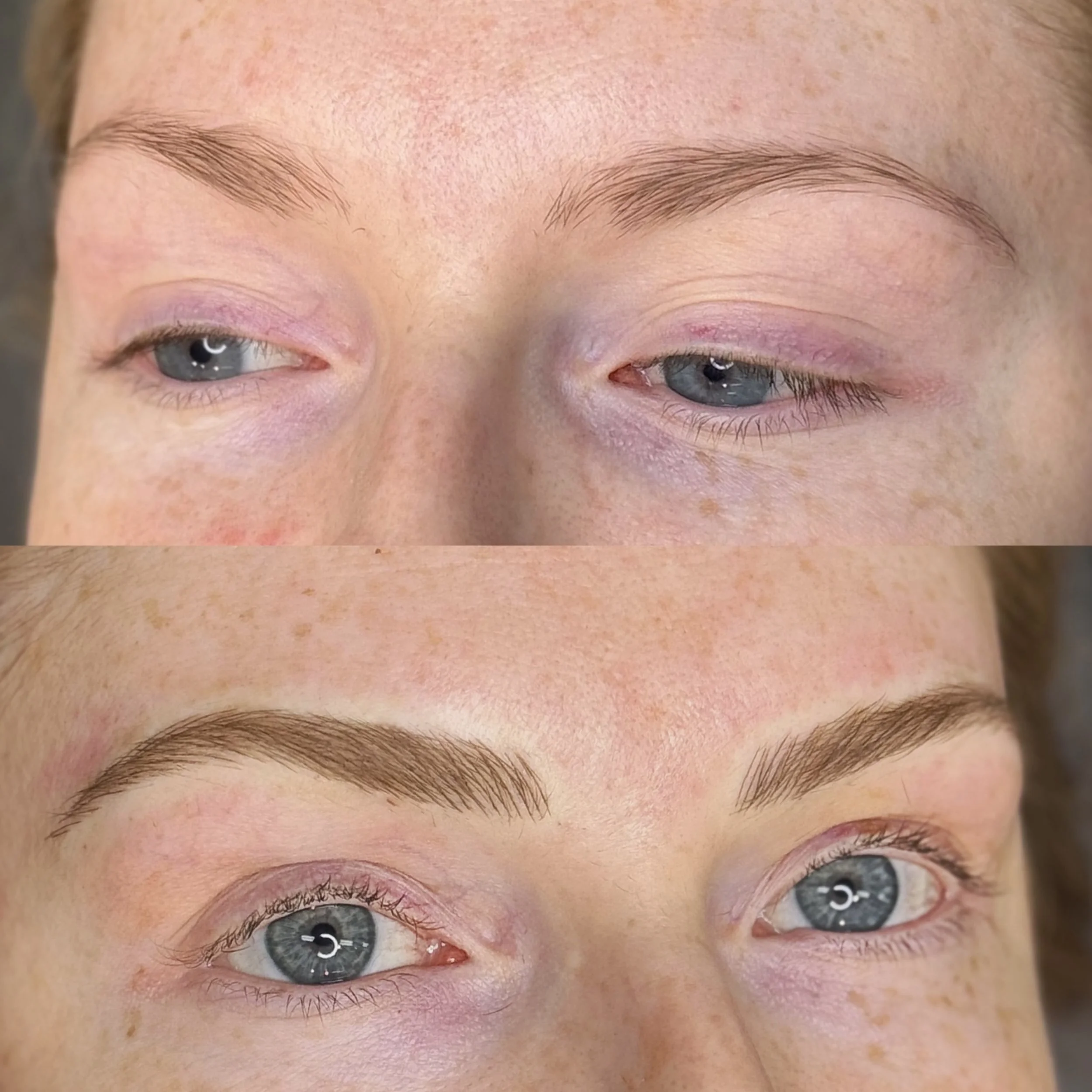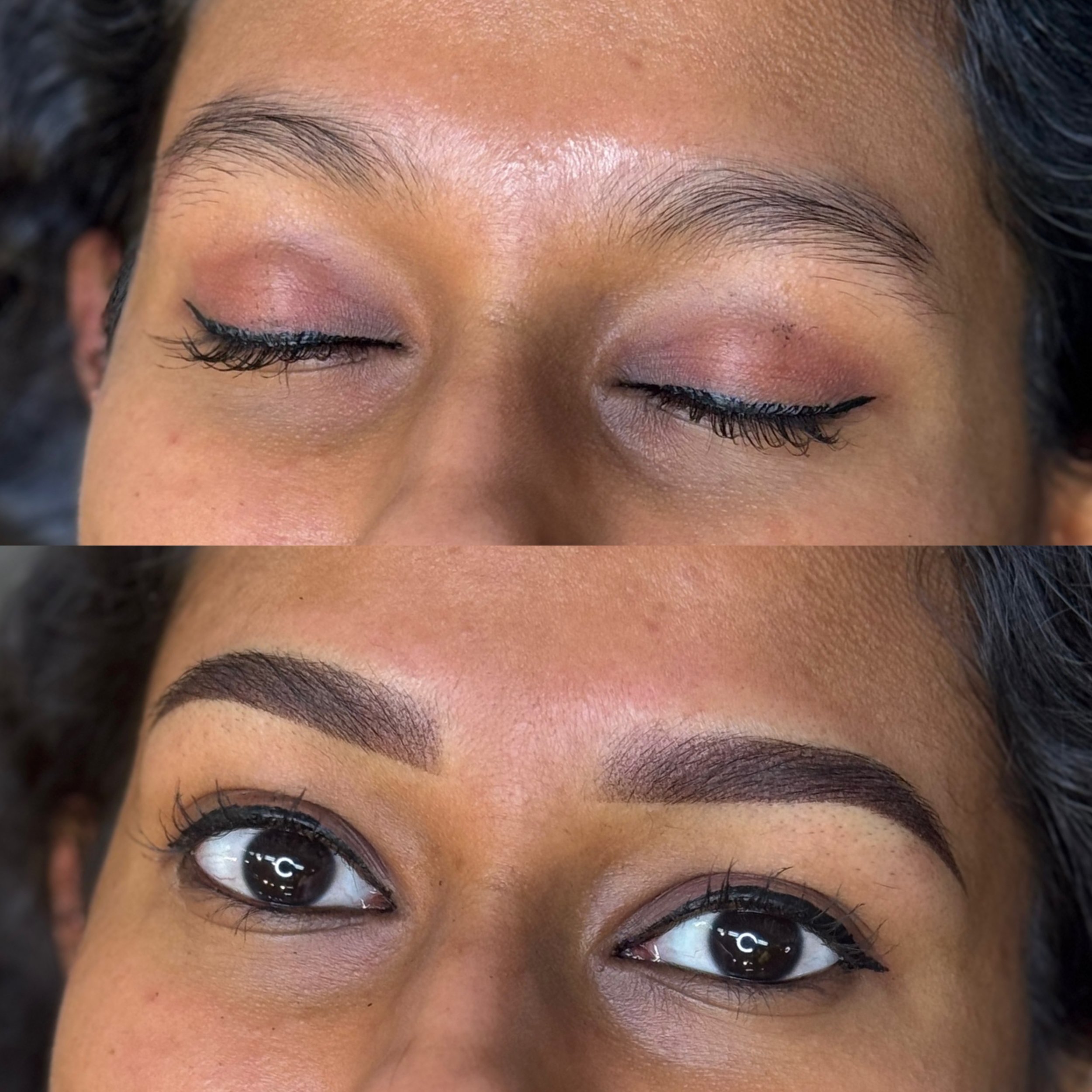 Microblading is a technique that uses a specialized hand tool comprised of ultra-fine needles to deposit pigment into the superficial layers of the skin in hair-like strokes that mimic the texture of natural brow hairs. This technique is well suited for skin types that are dry to normal without large pores or visible texture. In cases with skin types that do not fit the above description, please see nano brows.